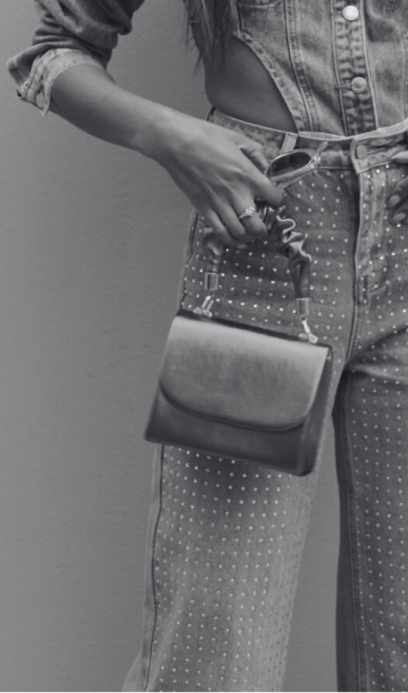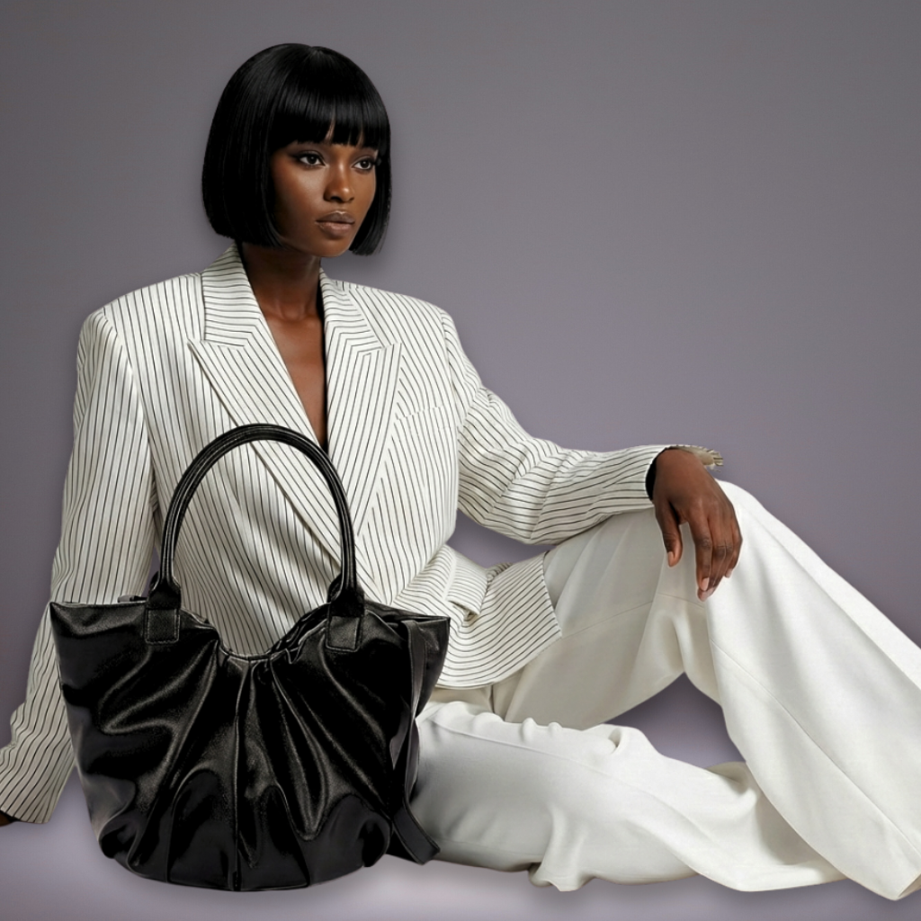 Complete your look with our stylish ruched faux leather tote bag, perfect for carrying your essentials.