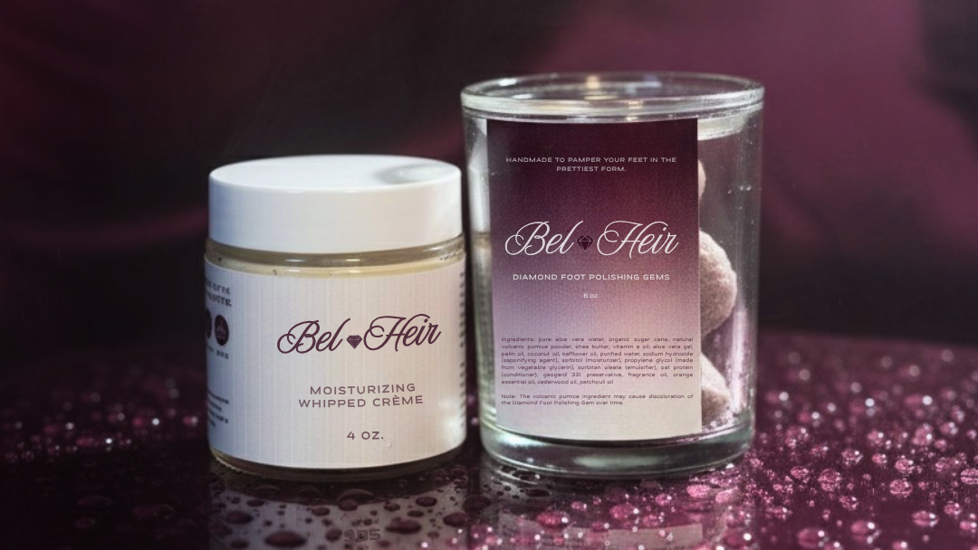 The Pamper Pretty Foot Care Kit begins with our handcrafted Diamond Foot Polishing Gem, designed to gently exfoliate and refine rough heels. Layer on the Moisturizing Whipped Crème, rich in shea butter, aloe vera, and kokum butter, to seal in lasting moisture and comfort.